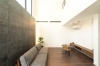 上を見上げると、開放的な吹き抜け空間。天井には間接照明とスタイリッシュなファンが設置され、モダンな空間を演出しています。小さな横窓からは、昼間に心地よい光が差し込みます。